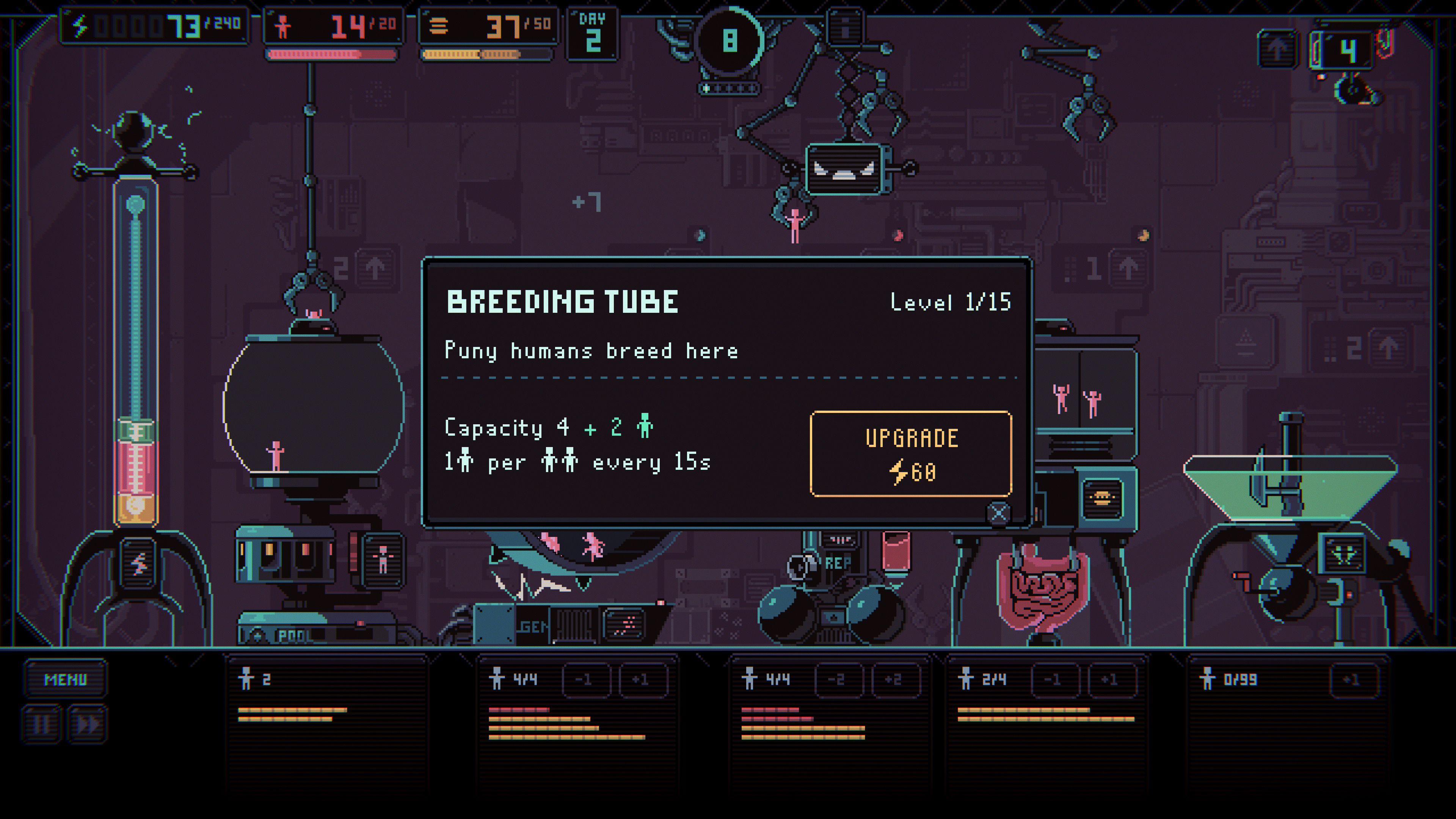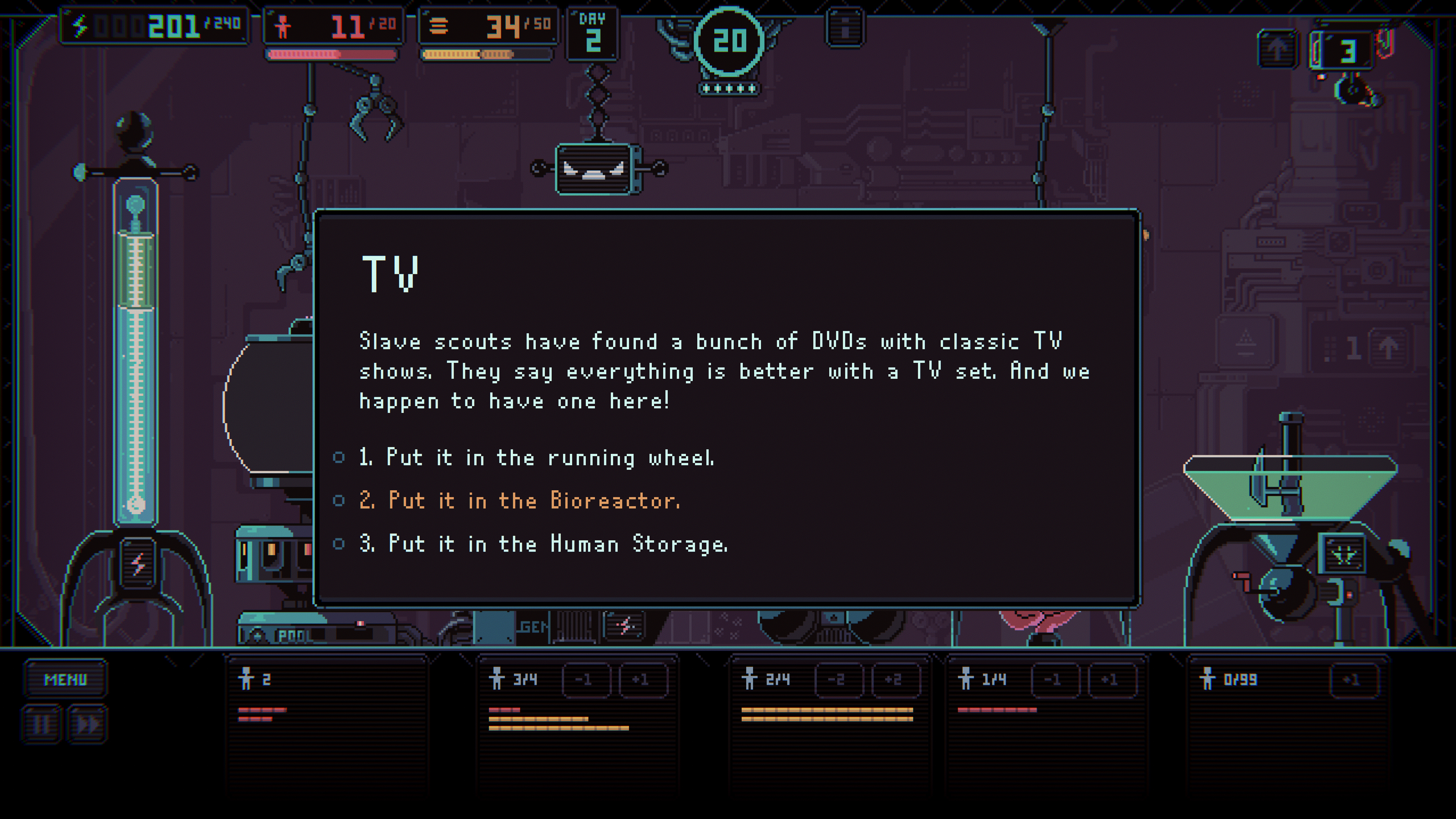 Humanity is enslaved by an AI… which is awesome, because we’re on the right side of the conflict. Exploit puny humans to extract power and build your own empire! You’ll have to keep track of them to make sure they don’t succumb to exhaustion and hunger… although the weakest ones can always be thrown to the Bioreactor.